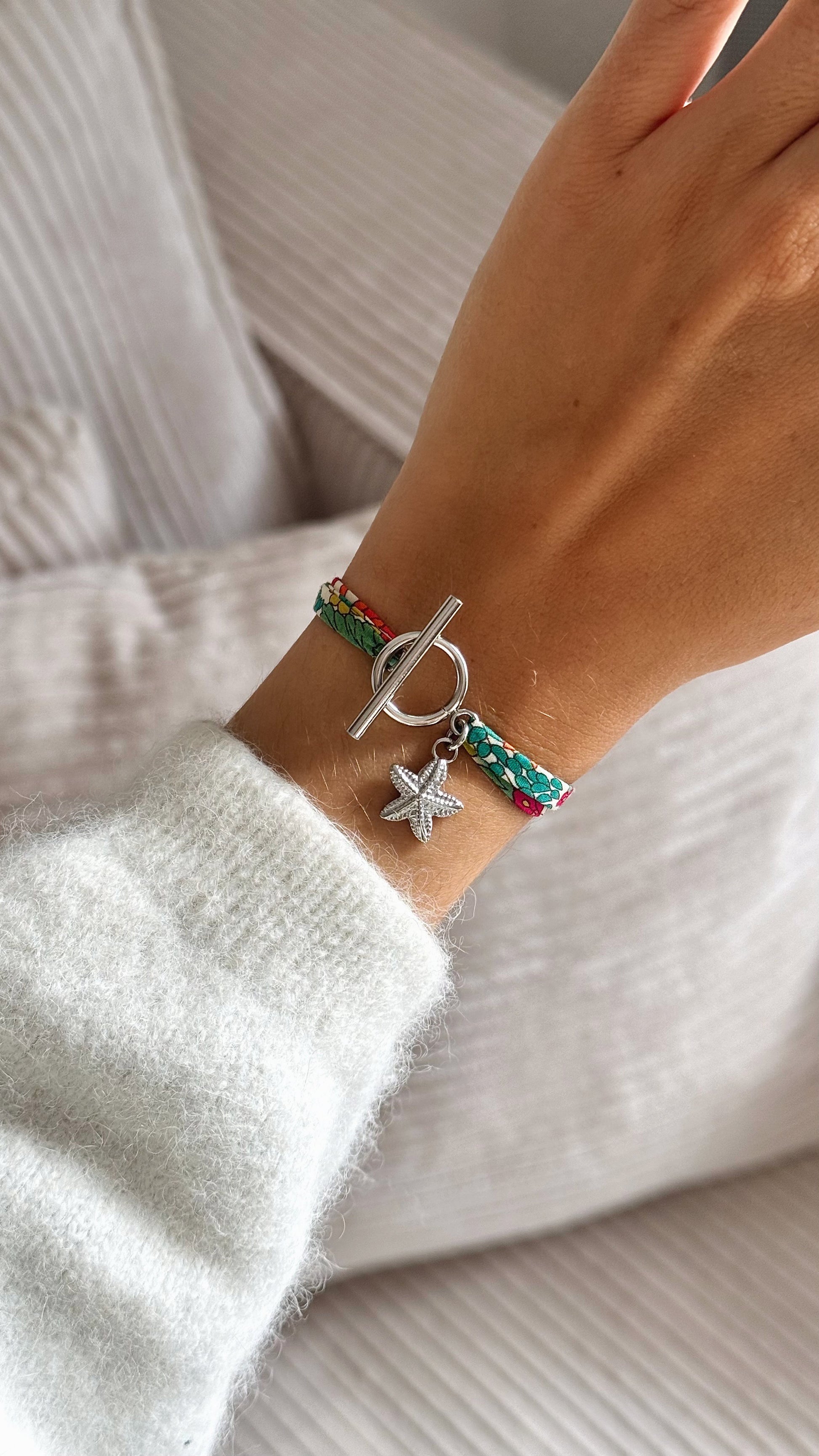 Le bracelet « AMY » est un bracelet avec un fermoir en acier inoxydable et une pampille en forme d'étoile de mer, elle aussi en acier inoxydable.