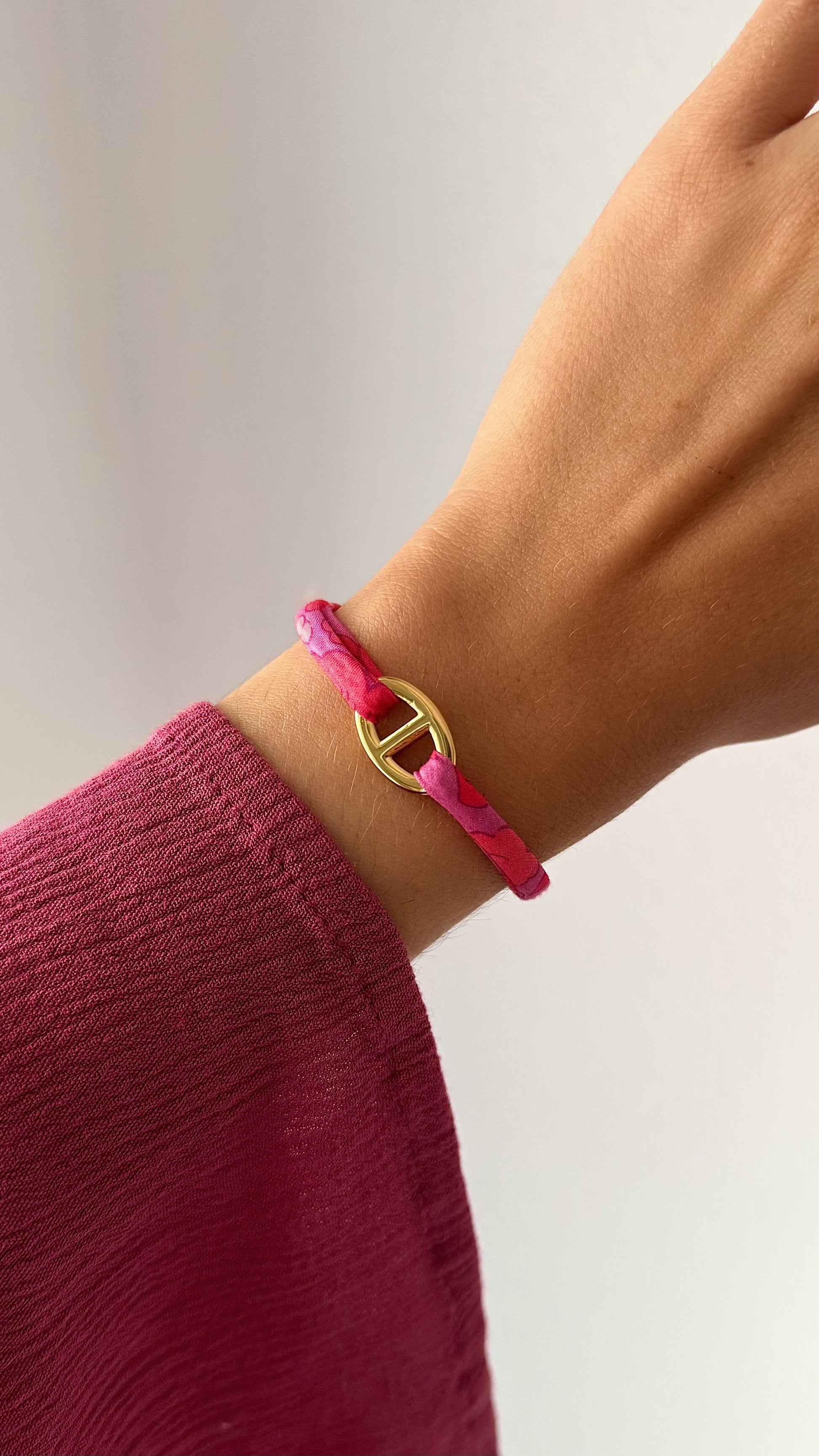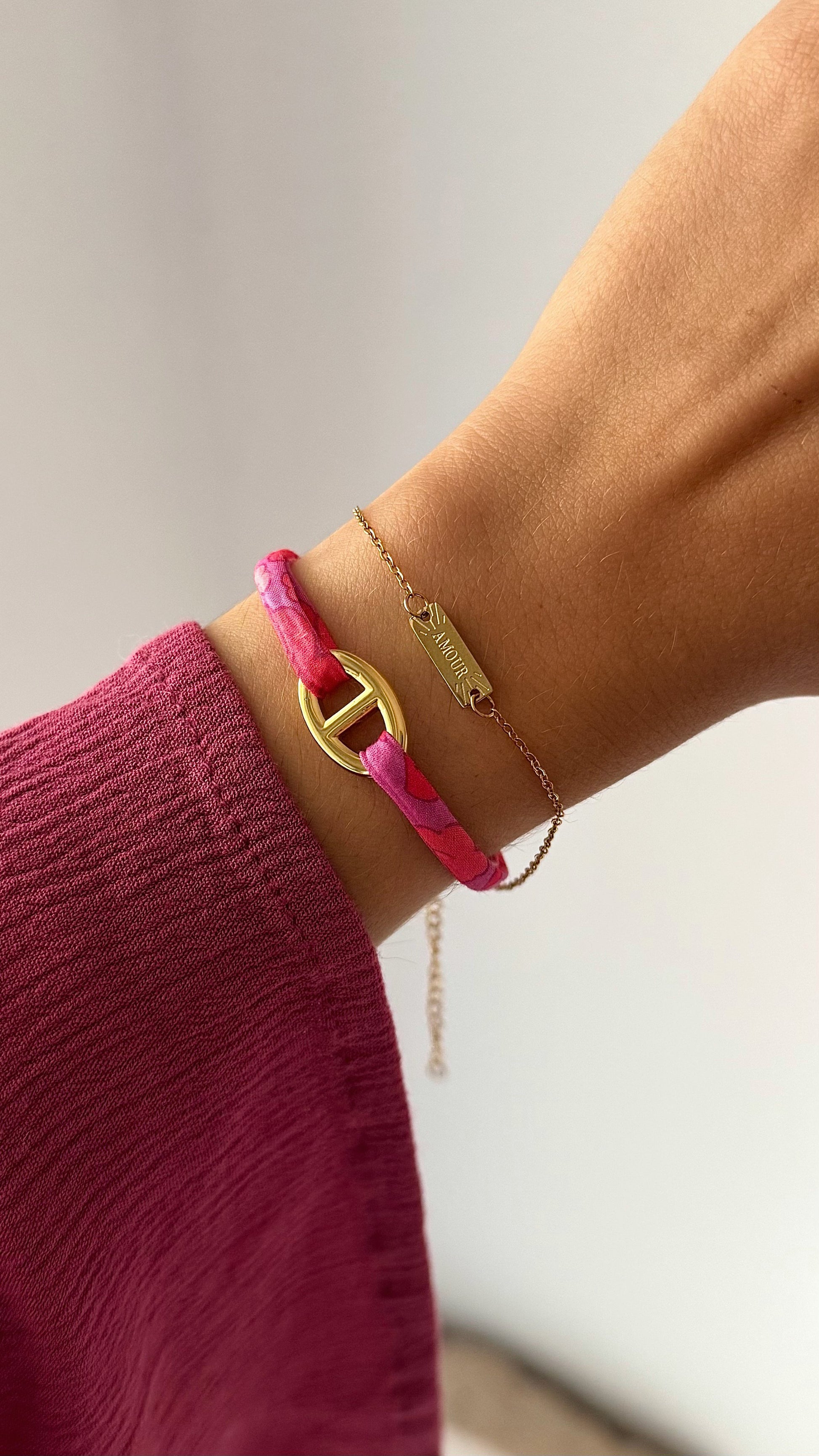 Le bracelet « FLAVIE » est un bracelet avec une maille marine en acier inoxydable et un cordon Liberty.